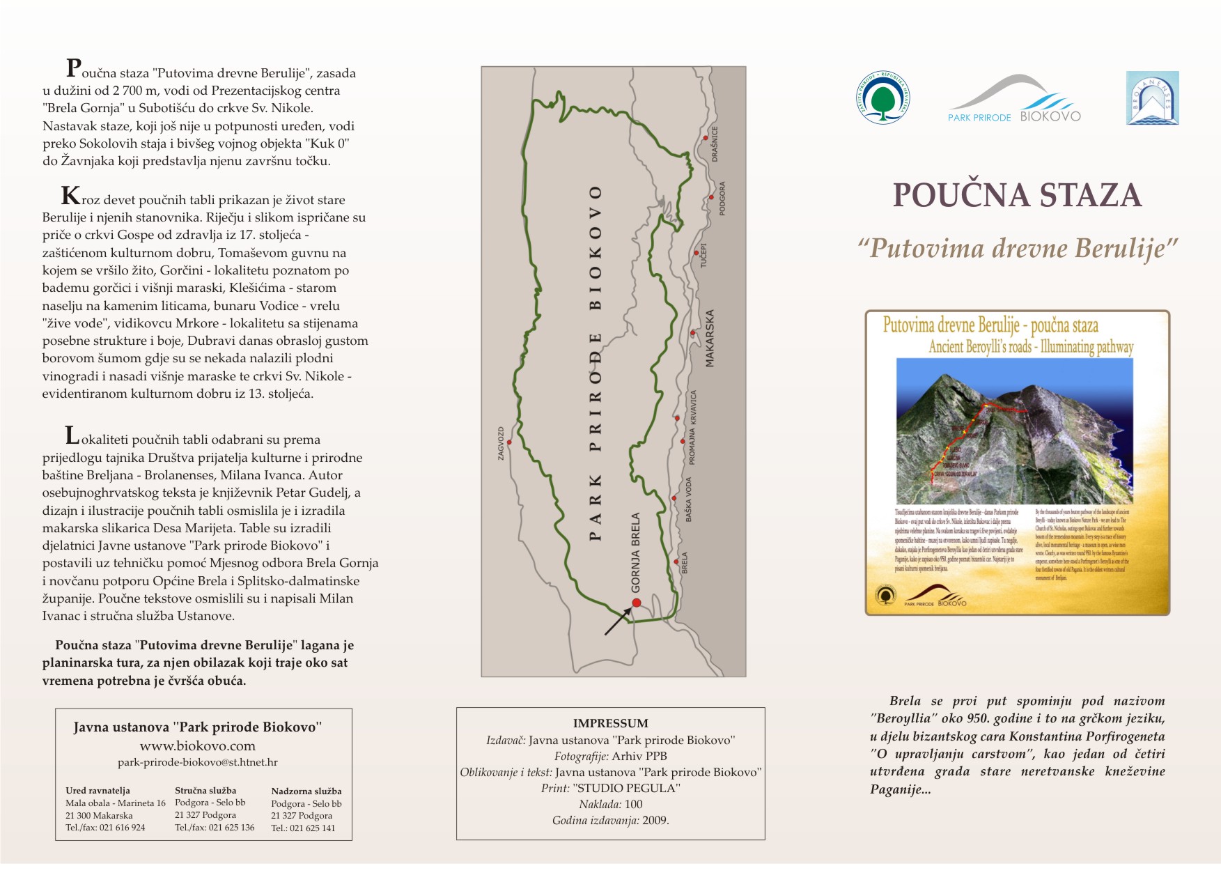 Prilikom prezentacije JU "Park prirode Biokovo", posebna pažnja posvećena je projektima Društva Brolanenses i JU "Park prirode Biokovo": Prezentacijskom centru Brela Gornja i Poučnoj stazi "Putevima drevne Berulije".